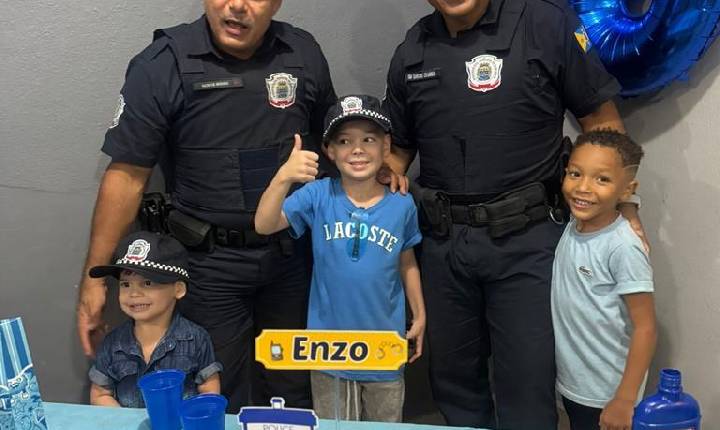 A decoração trouxe bonequinhos fardados no bolo, além de guardanapos, velas e balões personalizados. Tudo em azul, cor que remete ao uniforme da corporação. A comemoração ganhou ainda mais significado com a presença dos guardas civis municipais Edielson da Silva Moura e Sandro Eduardo Nascimento, que participaram da festa fardados. Enzo e o irmão Zaion, de três anos, comemoraram a visita e registraram o momento em fotos ao lado dos agentes.