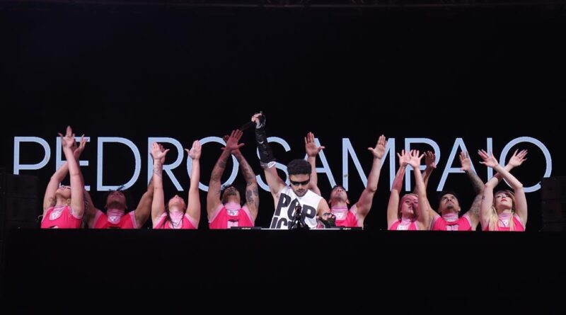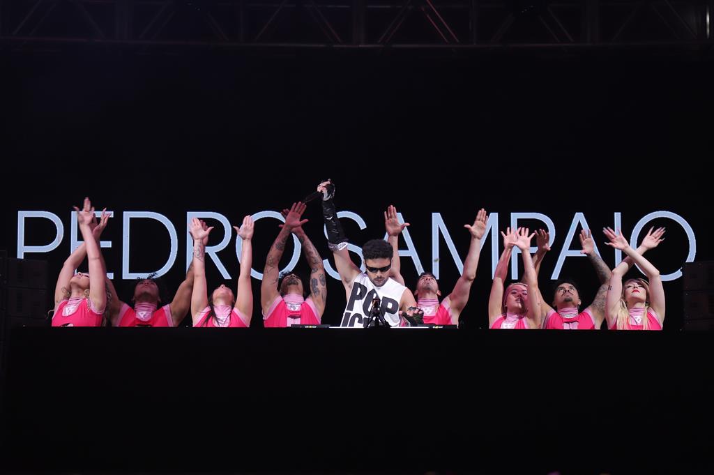 No telão, Pedro Sampaio abriu a noite com um trecho narrado por Antônio Abujamra: “Se você não encontrar razões para ser livre, invente-as. Seja criativo. Seja caótico.” A frase serviu como fio condutor para a performance cheia de energia do DJ.