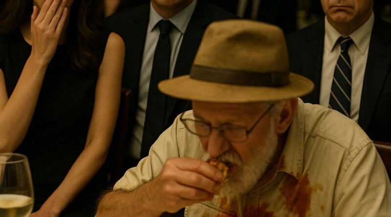 No restaurante chique, o velho meteu a mão no prato e começou a comer, fazendo bolinho de arroz no meio
