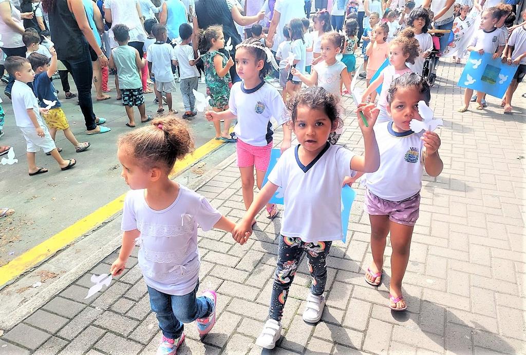 Vestidos de branco e acompanhados pela comunidade escolar, as crianças seguiram as ruas próximas a escola, cantando canções relacionadas à paz.