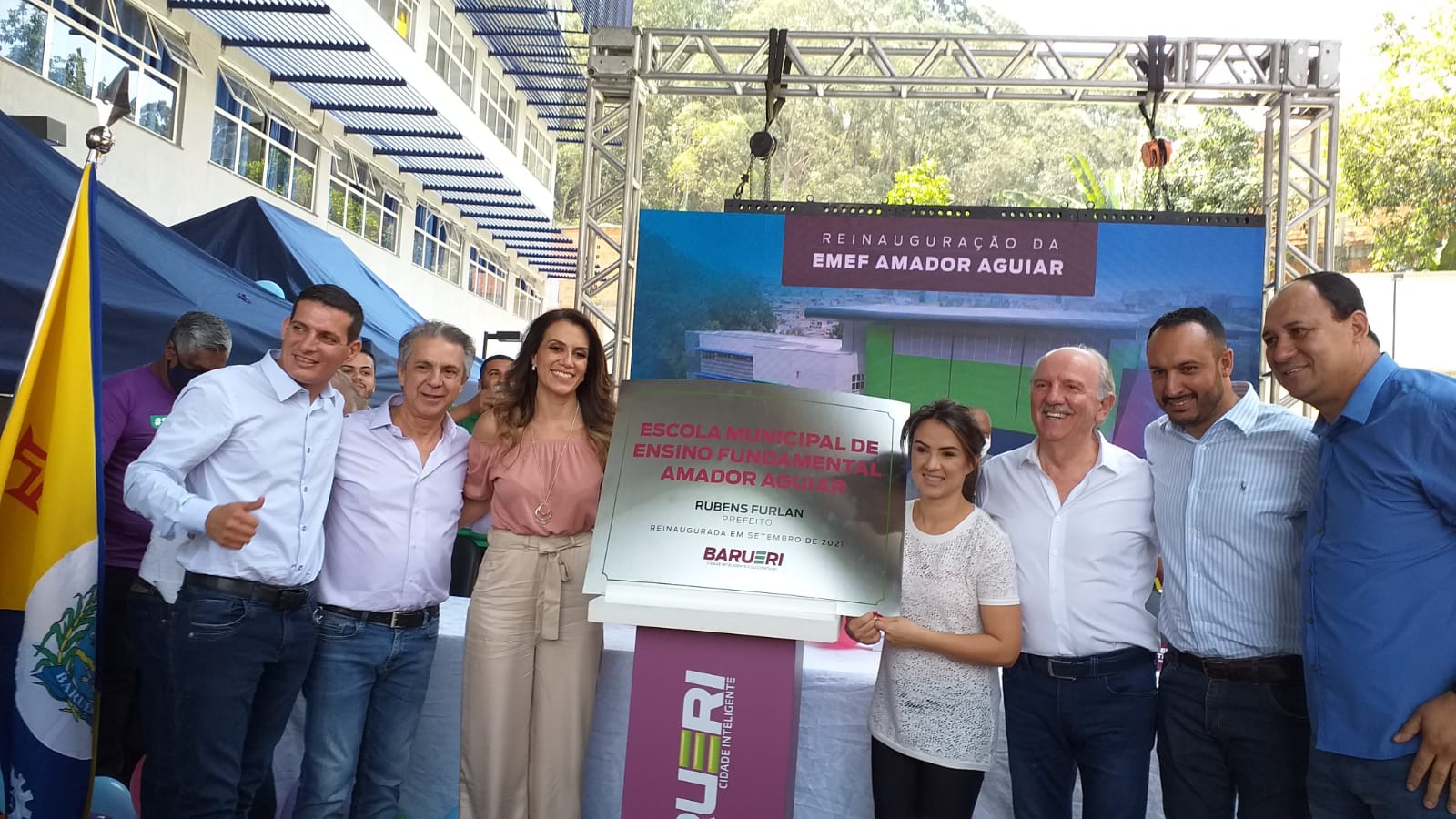 Levi Jânio (vereador), Rubens Furlan (prefeito), Aline Bertolini (Diretora da EMEF Amador Aguiar), Bruna Furlan (deputada federal), Beto Piteri (vice-prefeito e secretário de obras), Rafa Gente da Gente ,(vereador) e Fabinho do Imperial (ex-vereador)