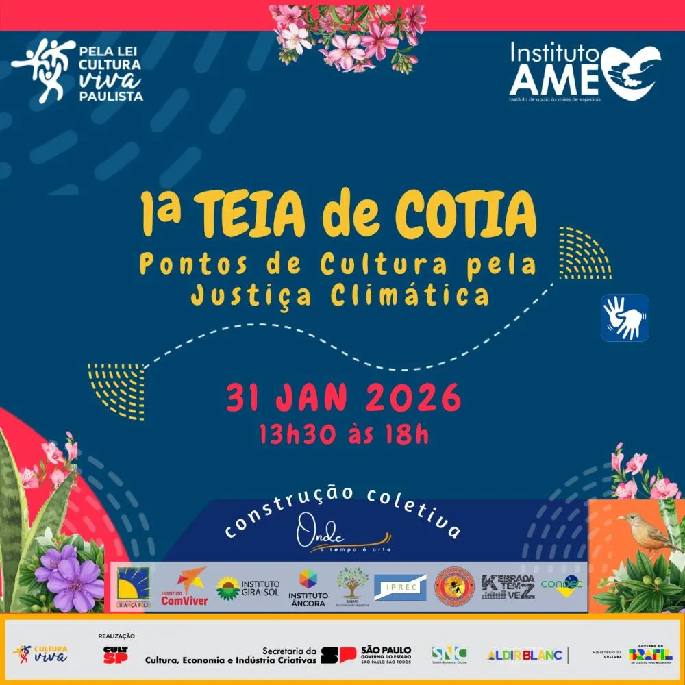 A cidade de Cotia realiza, no dia 31 de janeiro, a 1ª TEIA municipal de Pontos de Cultura, um encontro construído de forma colaborativa entre o Pontão de Cultura Instituto AME, os Pontos de Cultura e as Organizações Culturais que atuam no território, incluindo coletivos ainda não certificados.