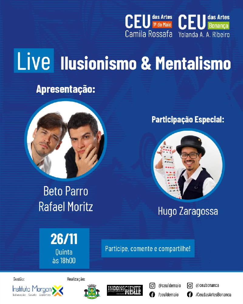 Então, a Prefeitura de Osasco, por meio da Secretaria de Cultura e o Instituto Morgan de Educação, Saúde e Esportes preparou a extraordinária live sobre “InconscienteMente”, um espetáculo leve e descontraído que abordará a complexidade da mente e do comportamento humano, por meio de técnicas de mentalismo (uma categoria do ilusionismo), aliadas a conceitos da psicologia.