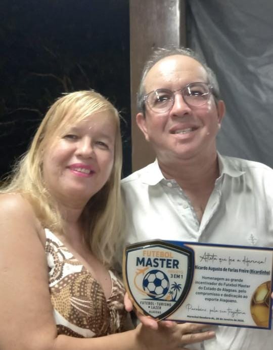 - Depois de muitos anos jogando futebol em Maceió, onde comecei no Palmeiras do Bom Parto, fui campeão alagoano infantil em 1982, depois me transferi para o Júnior do Clube de Regatas Brasil “CRB”, fui tetra campeão, fiz parte da seleção alagoana de futebol Júnior, fui escolhido o melhor lateral esquerdo nesse ano, fui profissionalizado e por não aceitar o salário oferecido deixei o futebol e fui ser proprietário de restaurante no centro de Maceió, encerrei cedo a minha carreira profissional. Como adoro futebol, criei o Time Master do CRB nos anos 80, continuei jogando e envolvido no Futebol Senior do CRB. Fico muito honrado em receber essa comenda “Projeto 03 em 01: Futebol, Turismo e Lazer”, ao lado de estrelas do futebol brasileiro como Peu, Joãozinho Paulista e Marcos Adriano. Agradeço de coração aos organizadores, a minha família e aos amigos que sempre torceram por mim, concluiu Ricardinho.