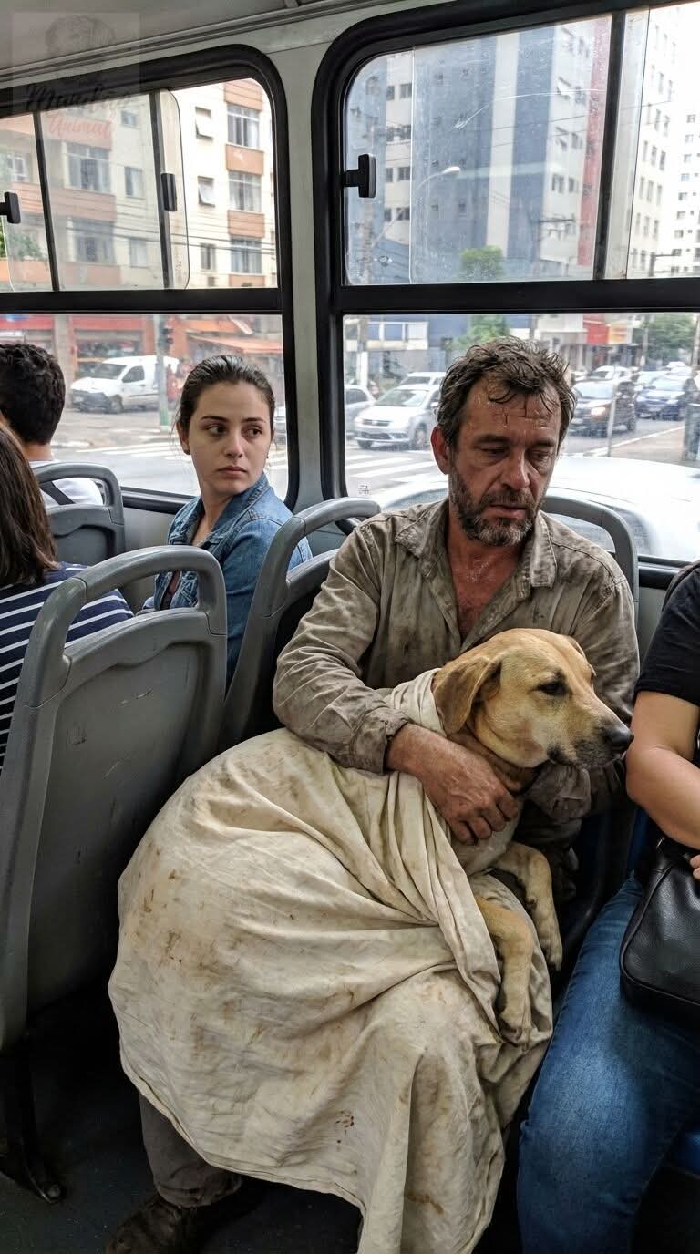 Na terceira parada, o ônibus fez uma curva e freou forte. Um homem entrou com um cachorro no colo, enrolado num lençol manchado. Era um bicho grande, mas mole, quase desmaiado.
