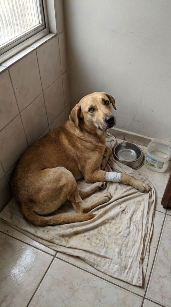 O cachorro, ainda com o lençol, deitado num cantinho. Fraco, mas com os olhos abertos.