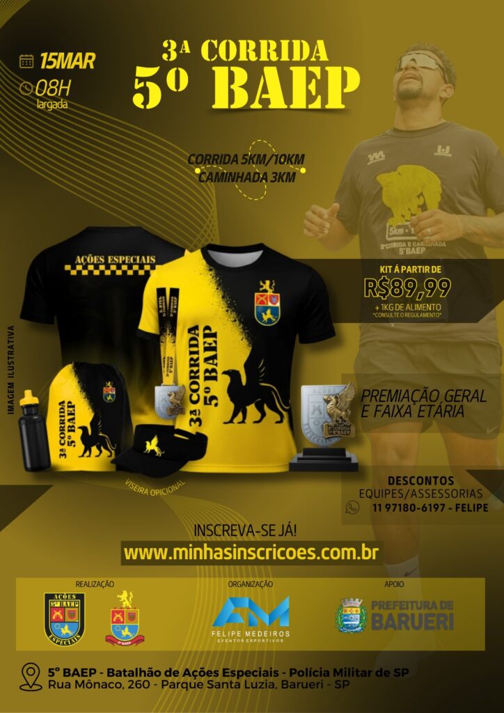 O 5º Batalhão de Ações Especiais de Polícia (5º BAEP) da Polícia Militar do Estado de São Paulo anuncia, com grande entusiasmo, a realização da 3ª Edição da Corrida e Caminhada do 5º BAEP, marcada para o dia 15 de março de 2026, em Barueri/Alphaville.