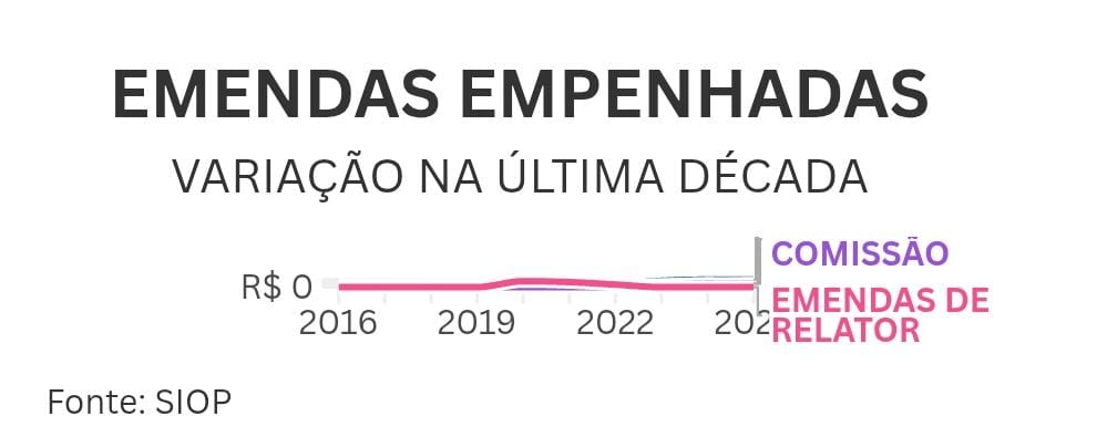 No comparativo, o principal aumento vem das emendas de comissões, que eram pouco utilizadas durante o governo Bolsonaro e após o encerramento das emendas do orçamento secreto passaram a ser mais utilizadas, em função da dificuldade em se identificar os verdadeiros autores das emendas. Em 2020 o governo do ex-presidente empenhou R$ 497 milhões. Já em 2025 foram R$ 11,2 bilhões.