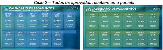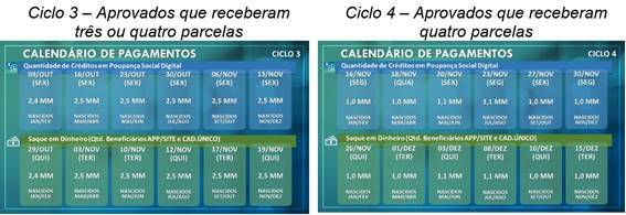 Na próxima quarta (22), 3,8 milhões de brasileiros nascidos em janeiro já receberão o crédito na poupança social digital. Os ciclos de crédito em conta e saques em espécie seguem até dezembro para o pagamento das cinco parcelas definidas pelo Governo Federal para o público do CadÚnico e para quem se cadastrou pelo App CAIXA | Auxílio Emergencial ou pelo site auxilio.caixa.gov.br, conforme o novo calendário (no final do texto)