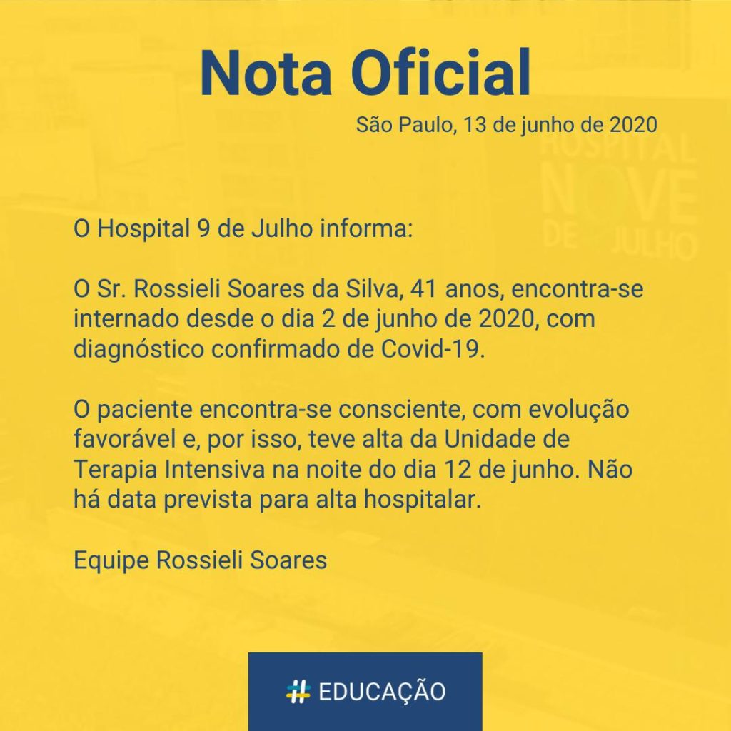 Infectado com o novo coronavírus, o secretário estadual de Educação de São Paulo, Rossieli Soares, deixou a UTI (Unidade de Terapia Intensiva) do Hospital 9 de Julho na noite de ontem (12).