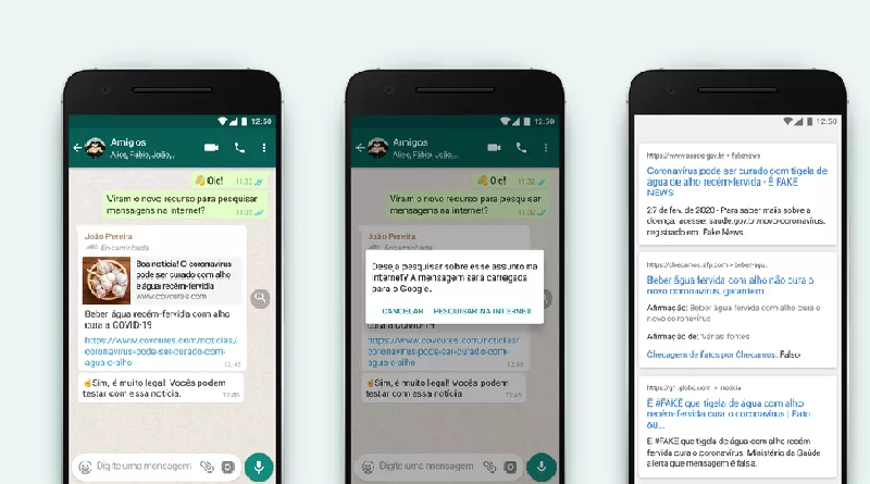 O WhatsApp anunciou nesta segunda-feira (3) uma nova função ao aplicativo. Um recurso de busca agora permite pesquisar no Google o conteúdo de mensagens muito encaminhadas. Disponível no Android e iPhone (iOS) e no WhatsApp Web, a medida tem como objetivo frear a disseminação de fake news e outras informações imprecisas no mensageiro. O recurso está em testes na versão mais recente do serviço disponível no Brasil, Espanha, Estados Unidos, Irlanda, Itália, México e Reino Unido.